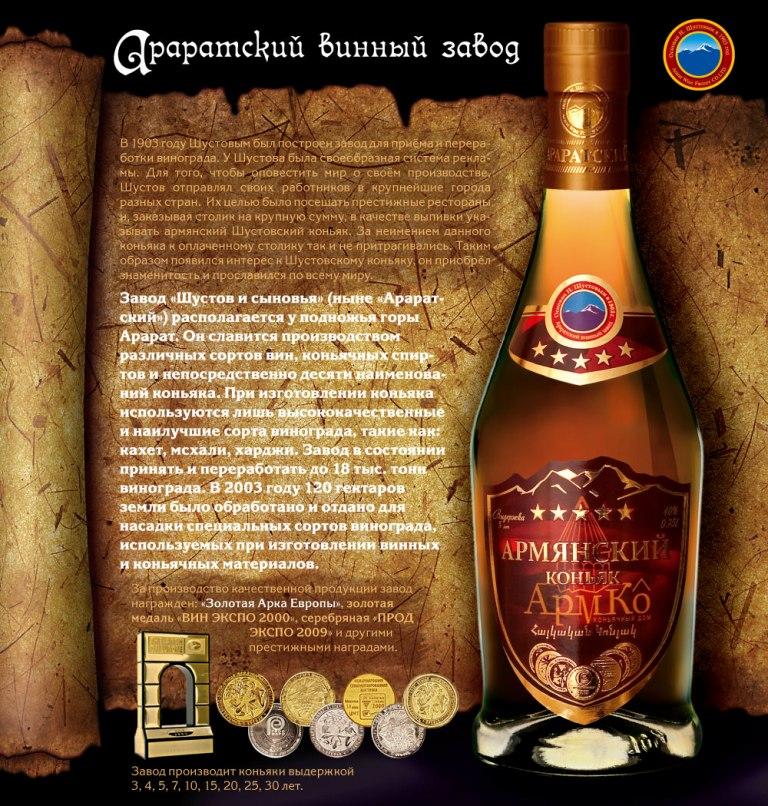 ООО «Коньячный дом «АРМКО» предлагает высококачественный коньяк, производства «Араратского винного завода». Завод, основанный купцом Шустовым в 1903 году, славится производством различных сортов вин, коньячных спиртов и коньяка. При изготовлении коньяка используются лишь высококачественные и наилучшие сорта винограда, такие как кахет, мсхали, харджи, выращенные на собственных плодородных виноградных плантациях Араратской долины и предгорий горы Арарат. Коньяк хранится в дубовых бочках при температуре +15 С с соблюдением технологий, имеющих вековые традиции.